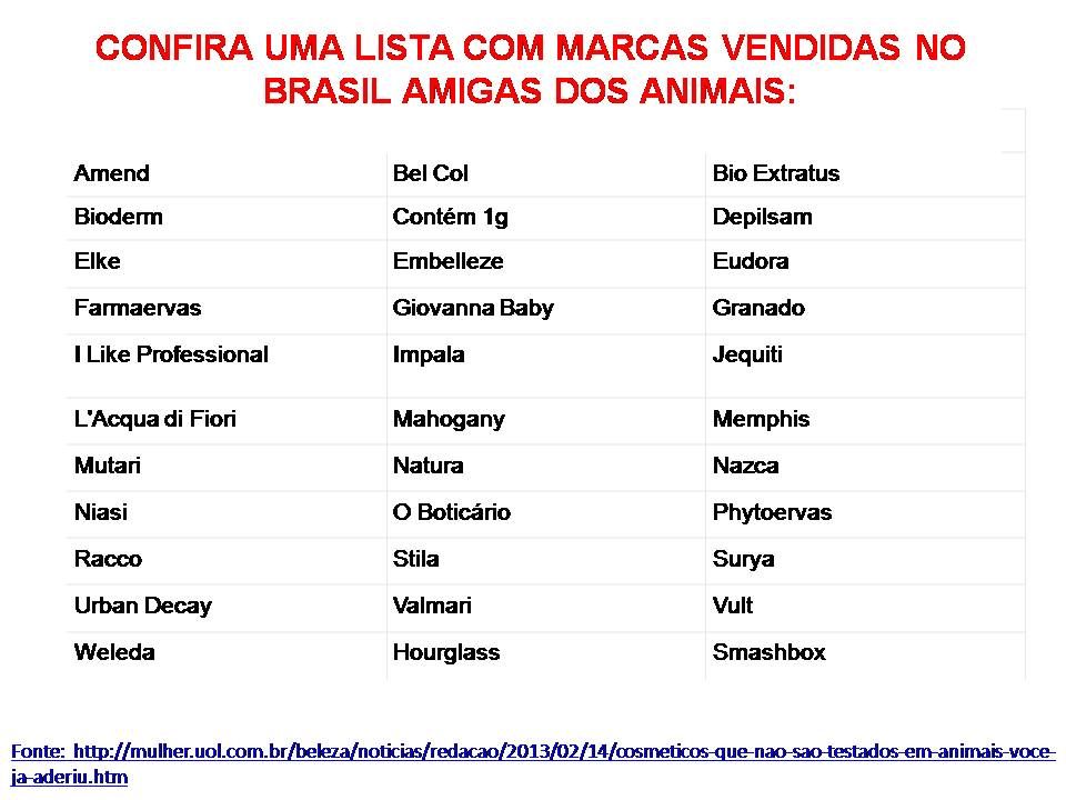 No Brasil, ainda não há novidades nesse sentido. O deputado estadual Feliciano Filho (PV-SP) tentou, sem sucesso, aprovar um projeto de lei que prevê que o consumidor seja informado, na embalagem, se o produto contém matérias-primas derivadas de animais ou que tenha sido elaborado através de método que utilize animal. O deputado federal Ricardo Trípoli (PMDB-SP) propôs um projeto de lei que inclui uma série de resoluções dedicadas a defender o bem-estar animal, mas que está parado há anos. "O consumidor tem o poder em suas mãos. É ele que pode mudar esse quadro", acredita Mônica Caliman. A webdesigner Claudia concorda: "Leis como a da UE são um começo, mas a mudança tem de ser mais profunda: na consciência de cada indivíduo".